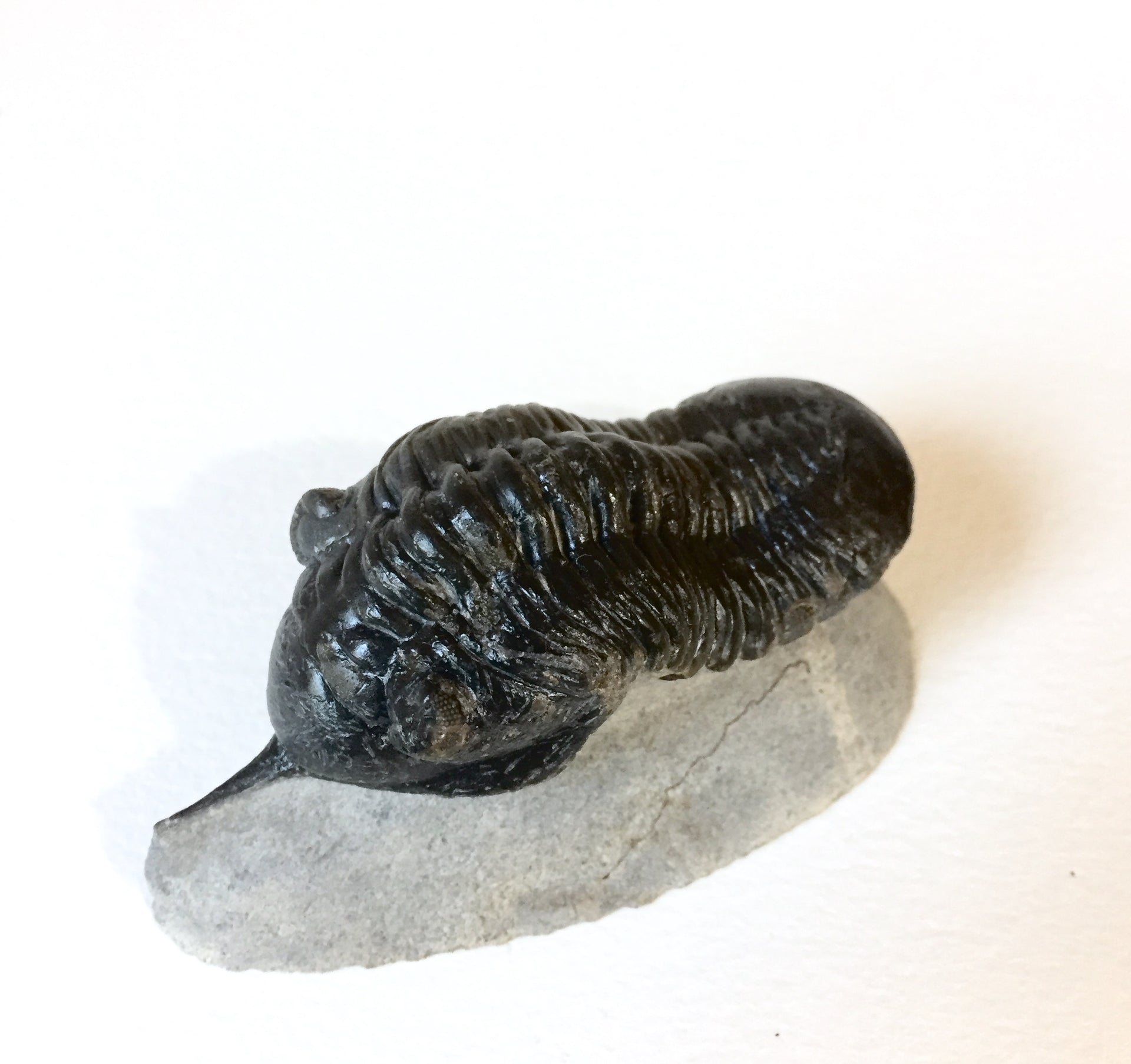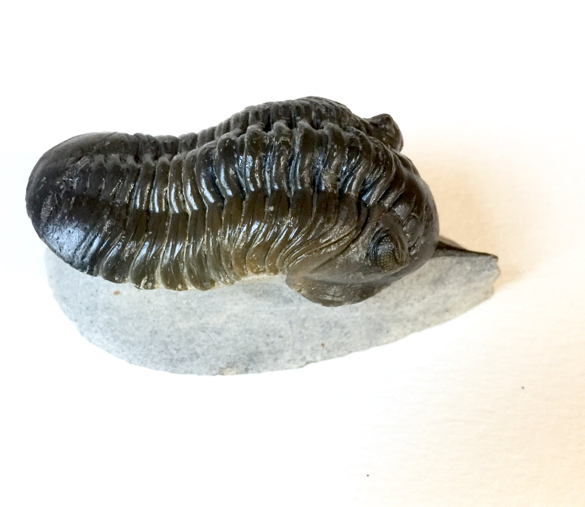 Trilobite fossil, guaranteed authentic. Morocanites mallodoides lived during the Devonian period in Morocco. Superb preservation. No restoration only expert cleaning.